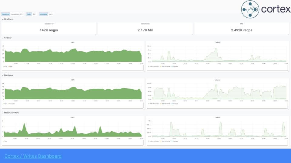 Imagine you’re operating Cortex, and you get paged because the writes are failing, or the Prometheus remote write is falling behind because it can’t write fast enough. What do you do? “This is my playbook for being on call for Cortex,” he said. “I get paged for writes. I go to something called the Cortex writes dashboard.”