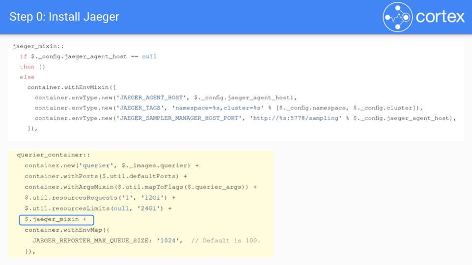 For debugging queries, especially those that are latency-sensitive, the Grafana Labs team uses Jaeger distributed tracing. To configure Jaeger into Cortex, you can use the Jsonnet above or simply add these enrollment variables: