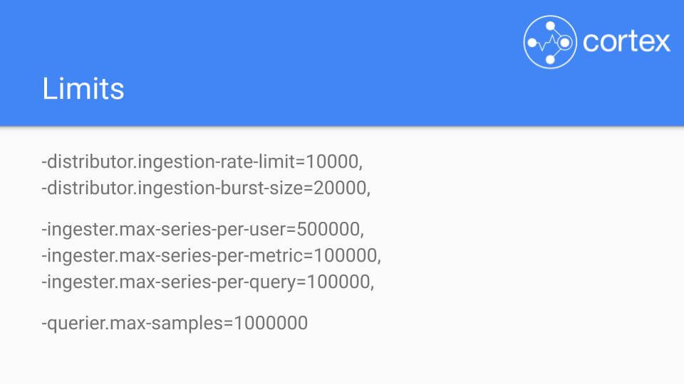 1. Keep the default limit for tenants very low, and once it’s hit, get an alert. “You need to make sure that they’re not querying 100 million time series or 5 million time series over 30 days of data,” he said. “You need to make sure that they are not OOMing all the queriers for everyone else.”