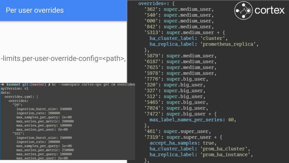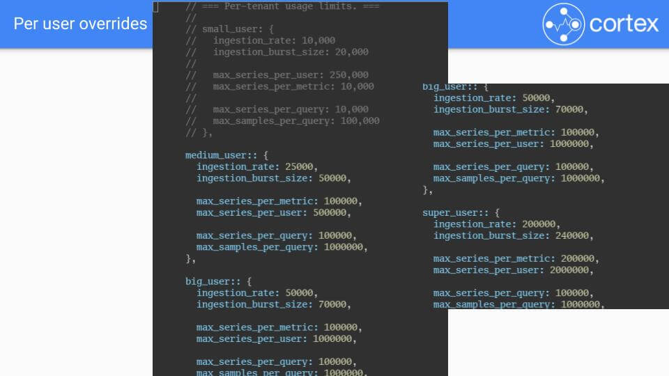 3. When customers hit the default limit, be able to increase the limit as needed. “Cortex is able to override the limits per user, and we use jsonnet on it to template this out because we have hundreds of users and we don’t want to set every one of them by hand,” he said. Grafana Labs uses override variables (small, medium, large, etc.) and a config management solution that’s open source. “There’s a config map that’s updated that Cortex takes up,” he said. “You can see how easy it is for us operators to manage this complexity.”