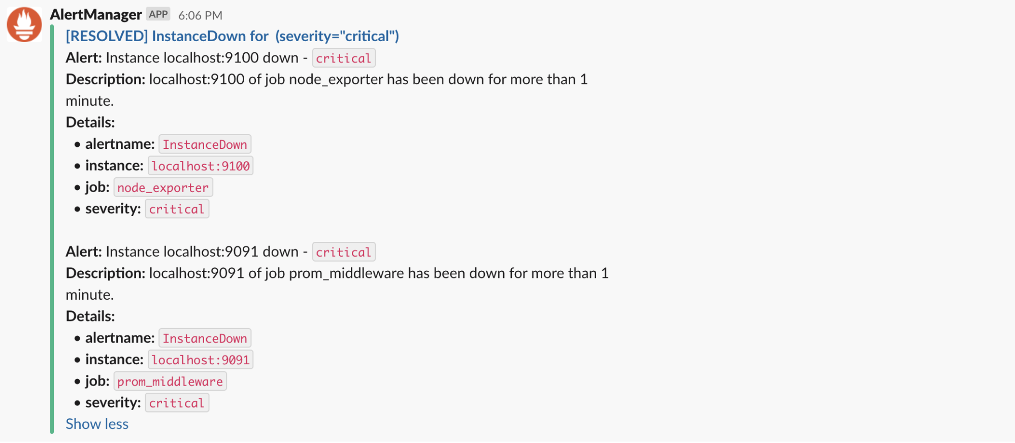 send_resolved: trueReload configuration by sending POST request to /-/reload endpoint curl -X POST http://localhost:9093/-/reload. In a couple of minutes (after you stop at least one of your instances), you should be receiving your alert notifications through Slack, like this: