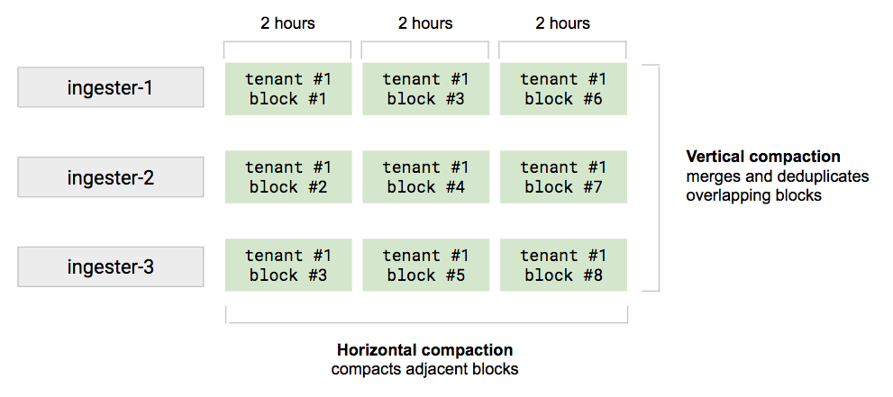 Now, the compactor is the service responsible for merging and deduplicating source blocks into a larger block. It supports both vertical compaction (to compact overlapping 2h blocks) and horizontal compaction (to compact adjacent blocks into a wider one).