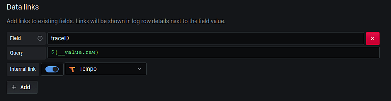 With this configuration, Grafana will look for an Elasticsearch field called “traceID.” If one is found, Grafana will build a link using this ID to the Tempo data source.