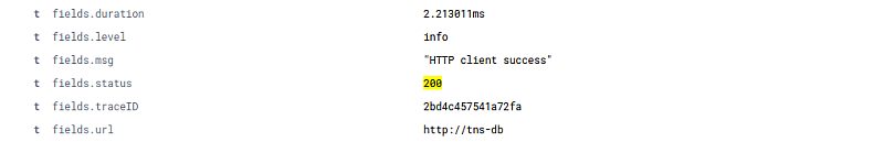 level=info msg="HTTP client success" status=200 url=http://tns-db duration=2.213011ms traceID=2bd4c457541a72fa…was parsed into the following fields in Elasticsearch: