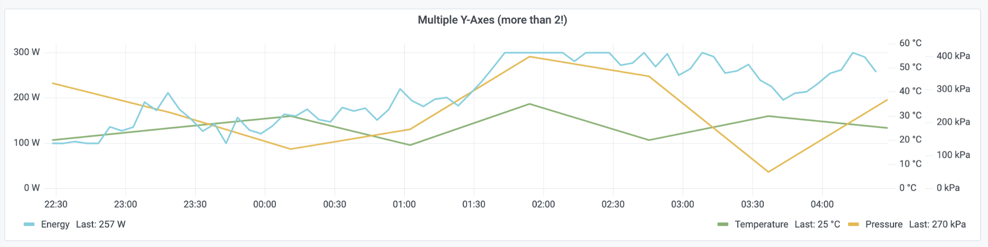 Thanks to using the new panel architecture, the Time series panel integrates seamlessly with the value mappings and unit configuration, enabling multiple y-axes (feature request) with position control as well as custom y-axis ticks based on the series value.