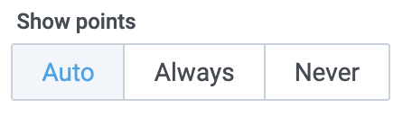 The Show points option enables control over the data points’ visibility. With this option set to “Auto,” Grafana will optimize the points’ display based on the number of data points in the visualization. If the density is too big, Grafana will hide the points by default, and when the visualization is zoomed in, the points will start showing up.