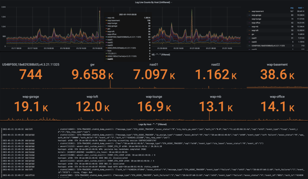 I returned to my effort to build out a dashboard, taking all of my (now easily gathered) device logs and applied the “logs to metrics” magic recently released with Loki. The net result was group summary counts over time by wireless access points!