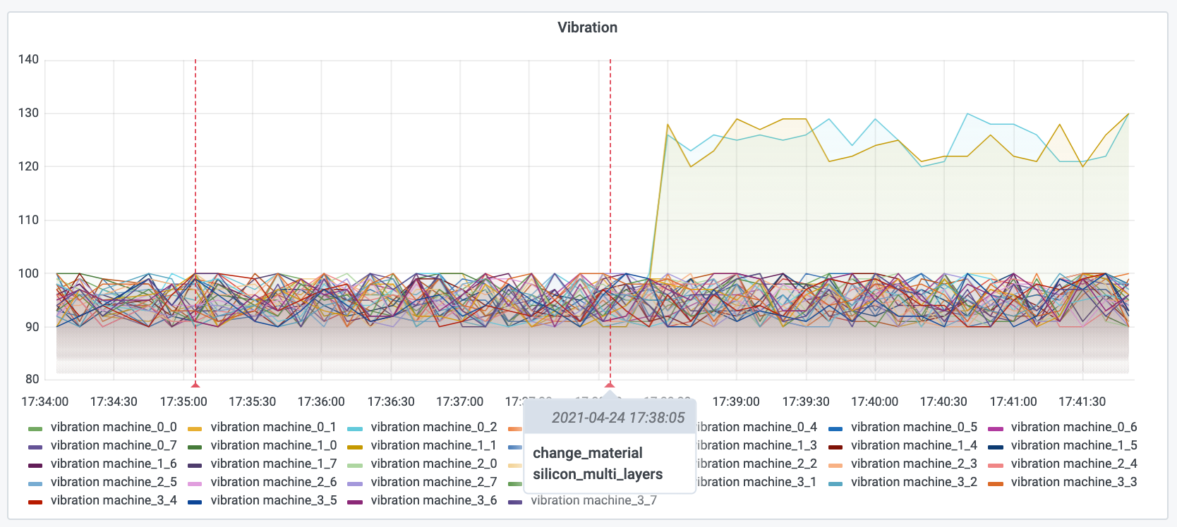 The SAP HANA® plugin supports annotations. This overlays visual markers on any graph to correlate events in SAP HANA® (such as maintenance activities) against time series metrics from other data sources, such as the sensor data. By adding this table as an annotations source, we get very insightful contextual data.