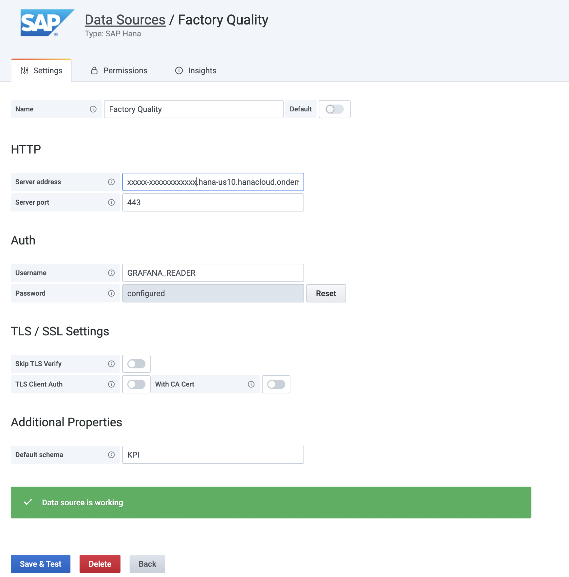 Once you’ve installed the plugin, configure SAP HANA® as a data source by going to Configuration > Data sources > Add data source. Select SAP HANA®. Add the server details, authentication credentials, and the schema that you want to query. An SAP HANA® schema is the equivalent of a database in traditional DBMS. Alternatively, click on the Permissions tab to enable data source permissions, an Enterprise feature that allows you to control who can query the data source. Your data source is now ready to query!
