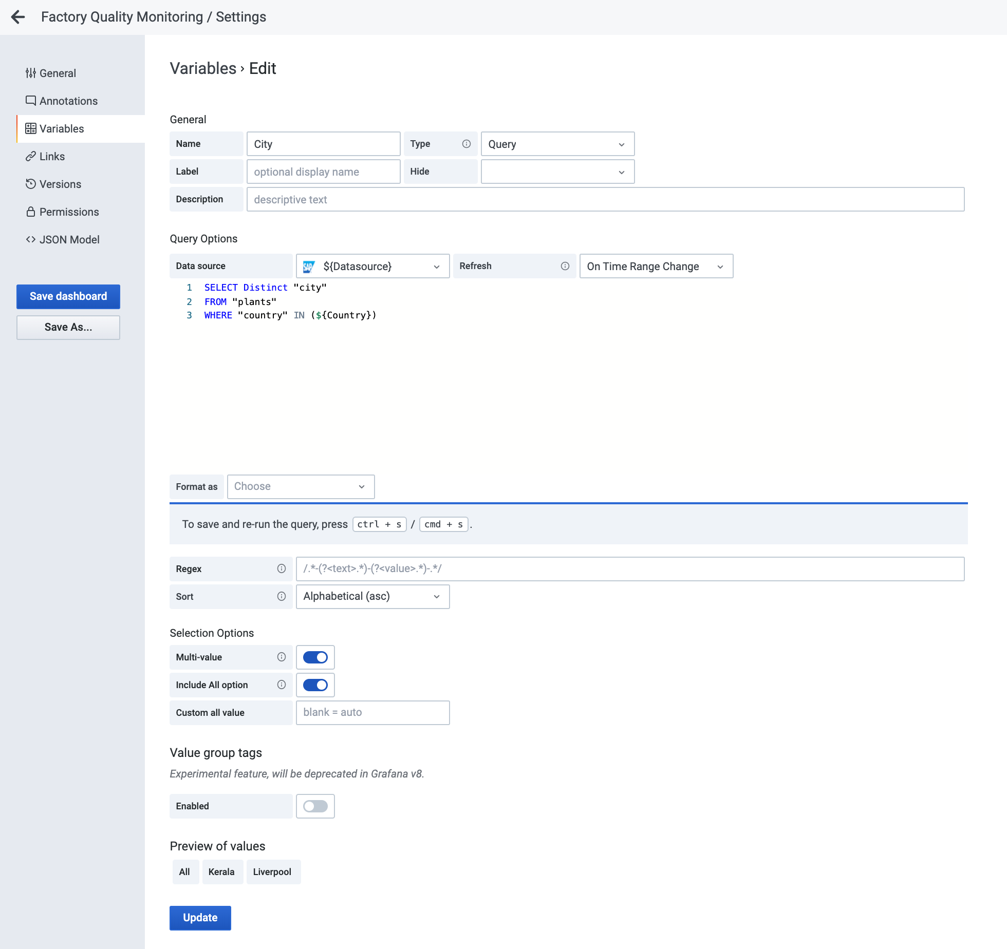 In our use case, we are monitoring the quality and the productivity of multiple machines in several plants spread over the world. When a quality issue is detected, the plant manager will need to slice and dice to find the root cause. So let’s extract these dimensions as template variables.