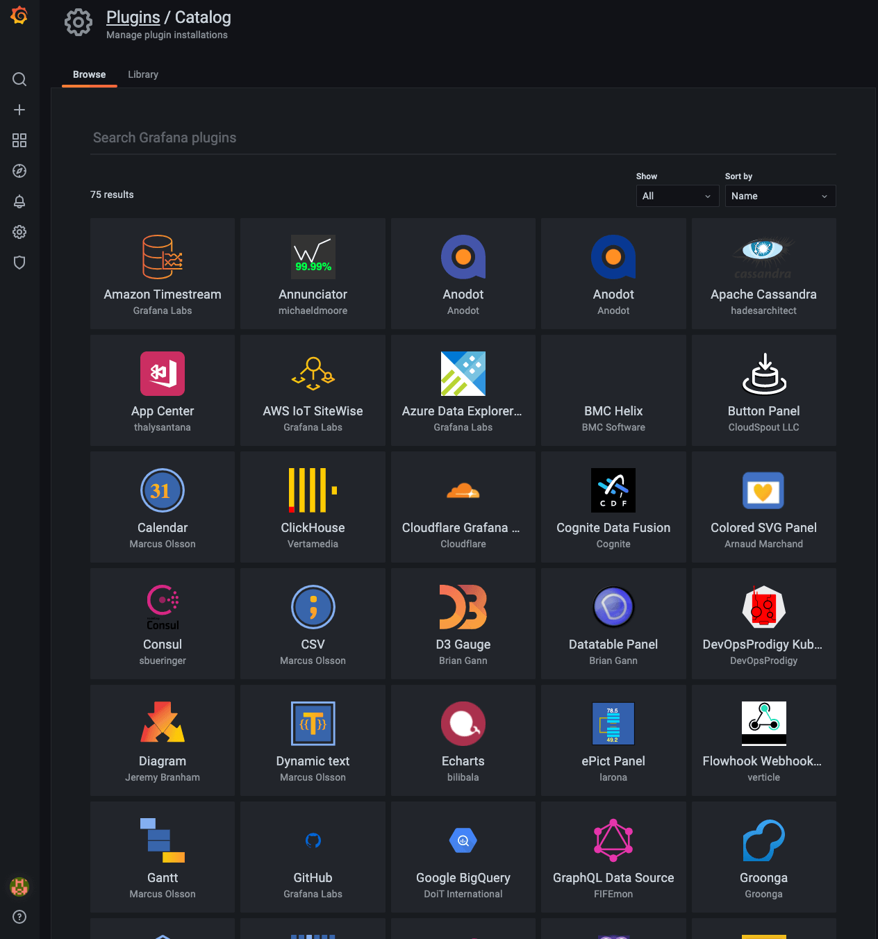 - For new users, the plugins catalog is a great place to browse and install a long list of plugins available with Grafana.