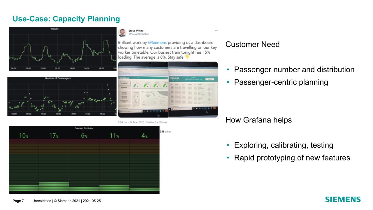 Another example is capacity counting (very useful for social distancing during the pandemic). “What we’re really working towards is to be able to understand in fine detail the dynamics of how passengers use the services, how they spread across the trains, and how that varies across the network,” said Klimmek. “Grafana has helped us in terms of rapidly prototyping new features, exploring, calibrating, testing, and then releasing into production quickly.”