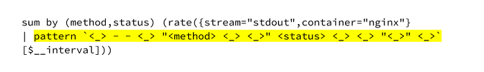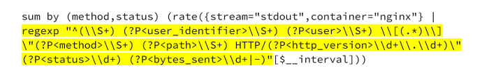Consider the parsing of NGINX logs to extract labels and values. To find the rate of requests by method and status, the query is scary and cumbersome. The regex is highlighted within this example query: