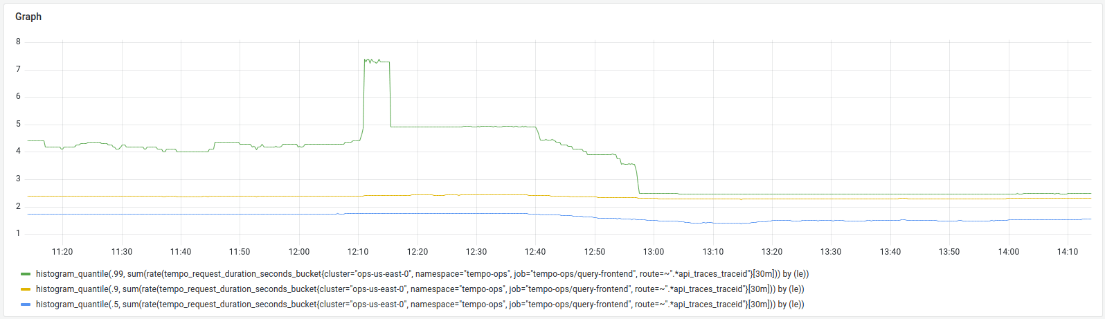 First, hedged requests allow you to retry a request to your backend a second time when it exceeds a configurable threshold. If this threshold is set to your backend’s p99, then Tempo will retry the slowest 1% of all backend requests. This can have an amazing impact on Tempo’s overall long tail: