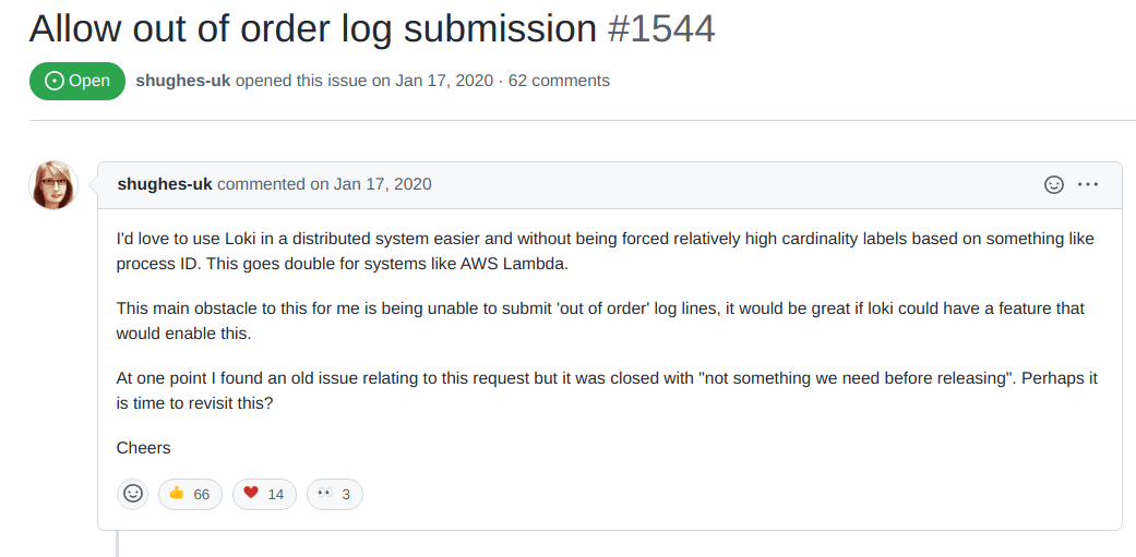The strict ordering constraint on Loki has long been a challenge for many Loki users, and please believe me when I tell you that we didn’t do this just to be difficult. Ingesting log data quickly and in a memory efficient way is challenging!