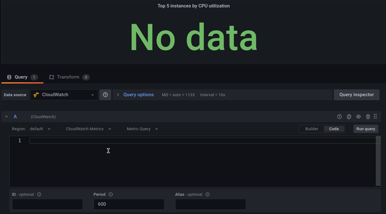 You can use Metrics Insights in the AWS CloudWatch plugin. Using this new feature is as simple as selecting the Metric Query type. The Metric Query type has two different modes: a Builder mode and a Code editor mode.