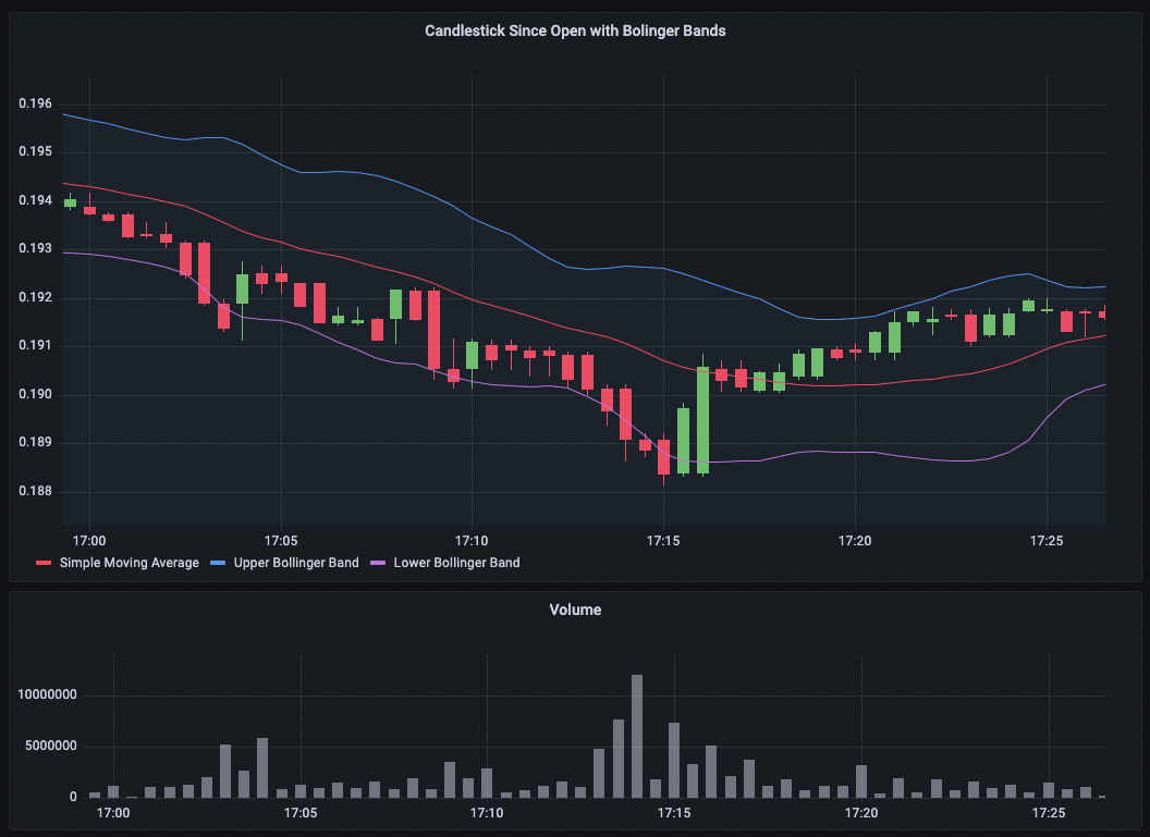 The Candlestick panel is an exciting new addition to Grafana, bringing with it a common visualization tool for financial data. The Candlestick panel includes native support for volume as well. It can also leverage the capabilities it inherits from the Time Series panel and graph any additional time series data — for example, simple moving averages, upper and lower Bollinger bands, and more. It also has an OHLC (Open, High, Low, Close) option, which takes the panel well beyond a simple Candlestick.