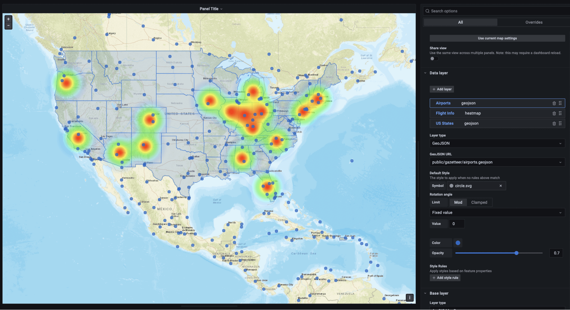 We’ve added multiple data layers to the Geomap panel, making it simple to create rich, multi-layered, geolocated visualizations. The updated Geomap panel makes it easy to create marker, histogram, and geojson layers in the same panel. Layer order is drag-and-drop, and you can pick markers from an extensive list of icons included with the Geomap panel.