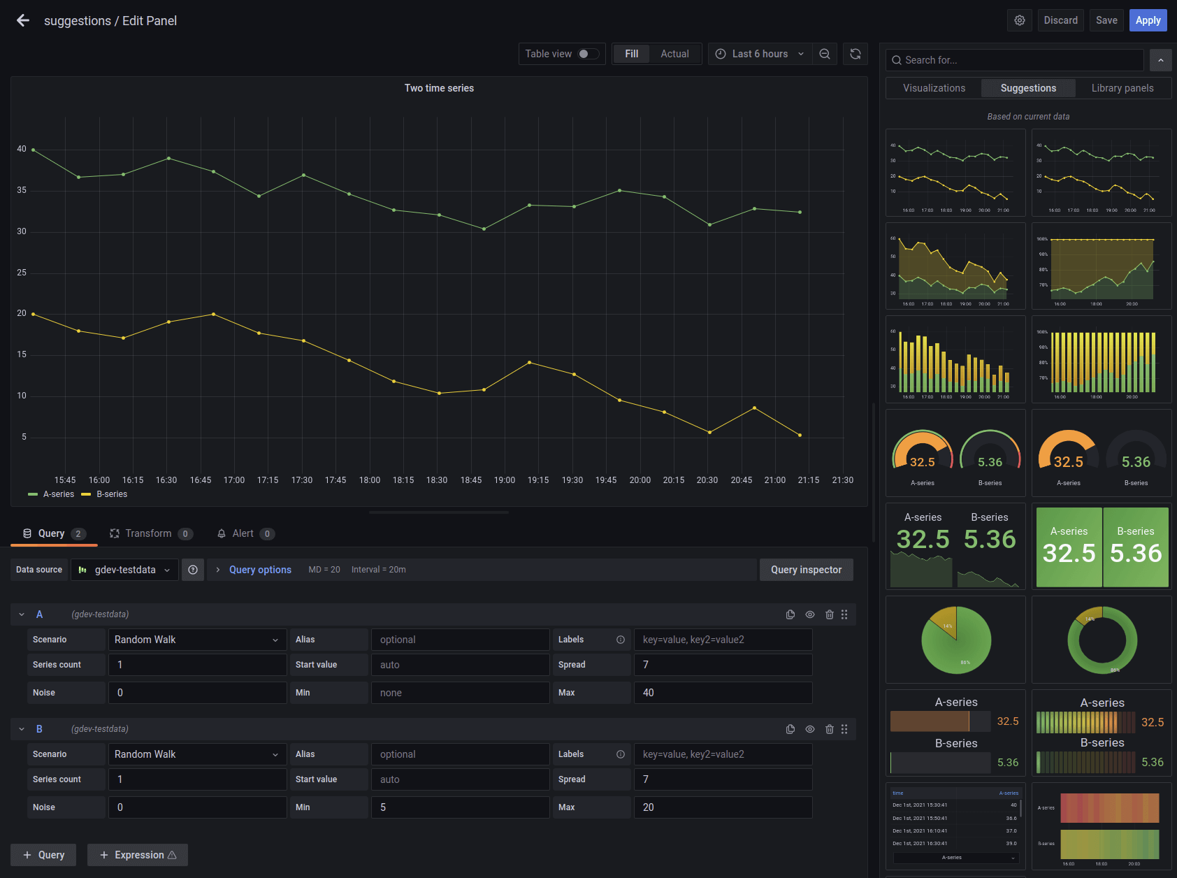Getting started with the right visualization can be a challenge. Grafana will now make visualization suggestions based on your panel queries, making it easier to jump into the right kind of visualization for your data. Visualization suggestions are also useful for exploring alternative views and options.