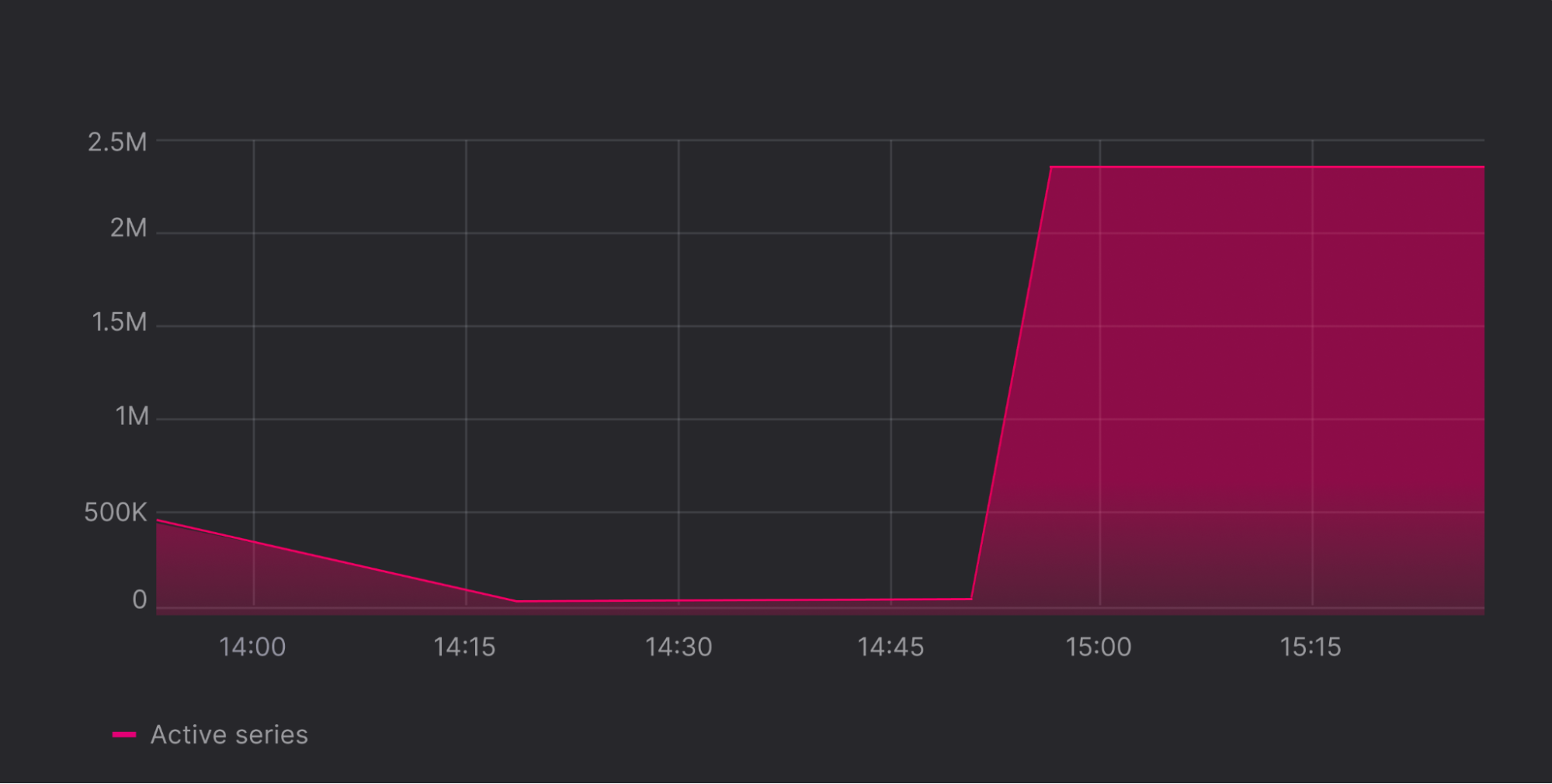 The image above shows what a sudden spike in cardinality looks like. See how the line slopes down a bit on the left of the graph? Someone may have changed some relabeling rules to drop an irrelevant label. But then you’ll notice that the active series drastically spikes. What happened here is that perhaps someone introduced a label that can have so many values that the number of series (a.k.a. your cardinality) is increasing rapidly. This means that the team is generating a lot more monitoring data than before — or perhaps, accidentally, too much.