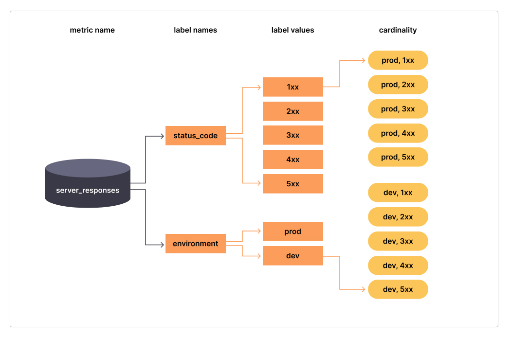 To put it simply: Cardinality is the overall count of values for one label. In the example above, the label status_code has a cardinality of 5, environment has a cardinality of 2, and the overall cardinality of the metric server_responses is 10.