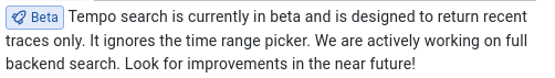 This message simply warned the user that the Grafana Tempo search was calibrated for recent traces only, regardless of the selected time window.