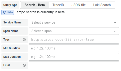 Above: Trace search criteria in Grafana Tempo. Note that the maximum searchable range is currently 24 hours.