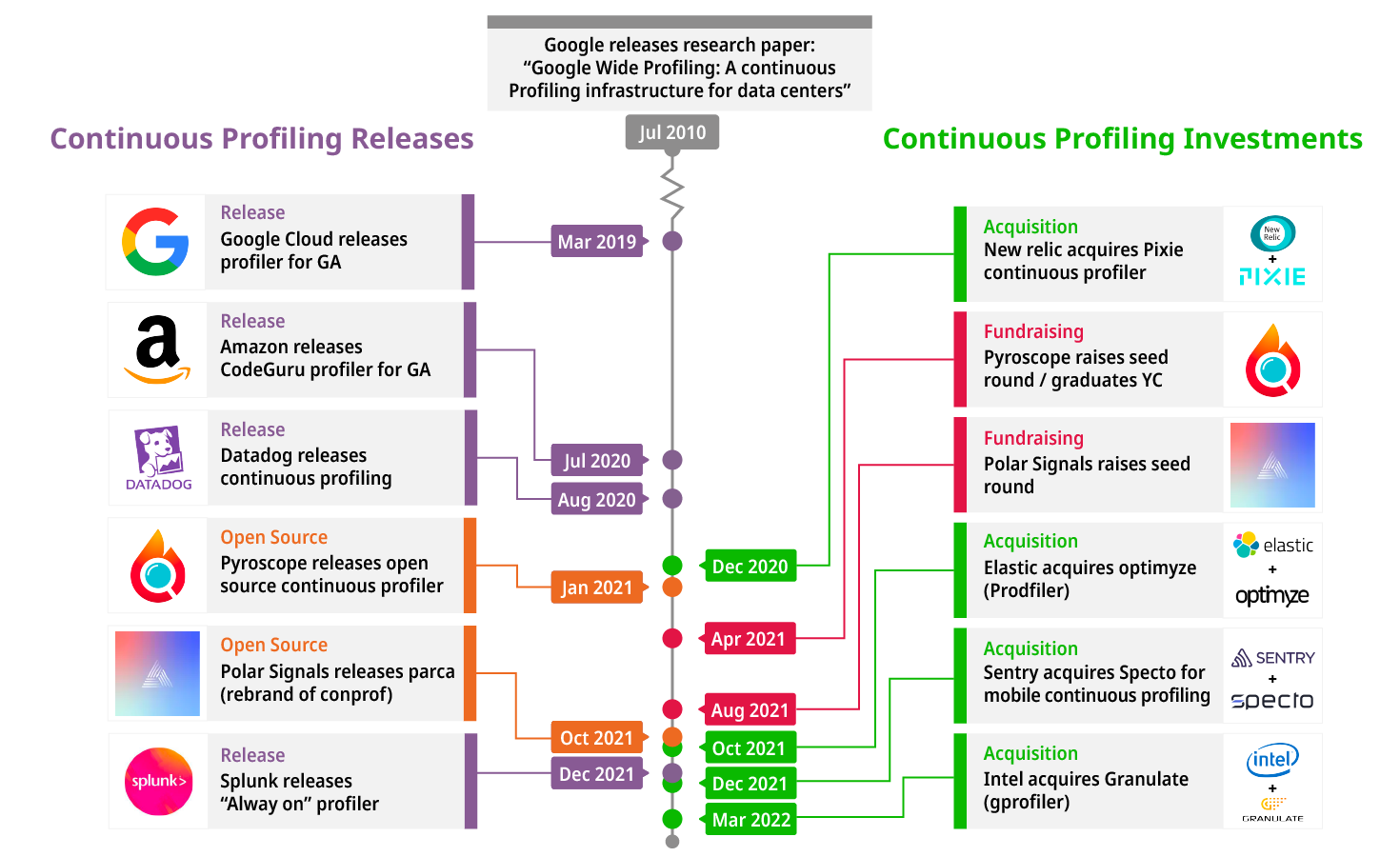 Since then, many major performance monitoring solutions have joined them in releasing continuous profiling products. As time has gone on, the continuous profiling space has been getting increasingly popular as various companies/VCs are more frequently making major investments in continuous profiling to keep up with demand for this type of monitoring.