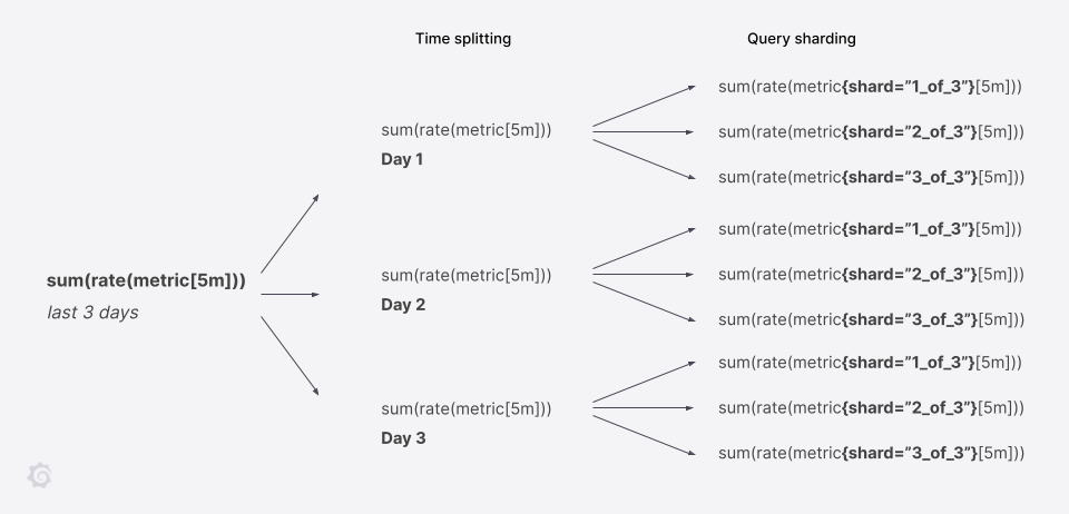 You may notice that even though -query-frontend.query-sharding-total-shards is set to 3 in the example, a total of 9 partial queries were generated and executed. This is because it is multiplied by the time splitting, but it may also be multiplied by the type of query and methods used. As such, -query-frontend.query-sharding-max-sharded-queries is used to cap the total number of partial queries generated (where the queries are split by time first and shards second).