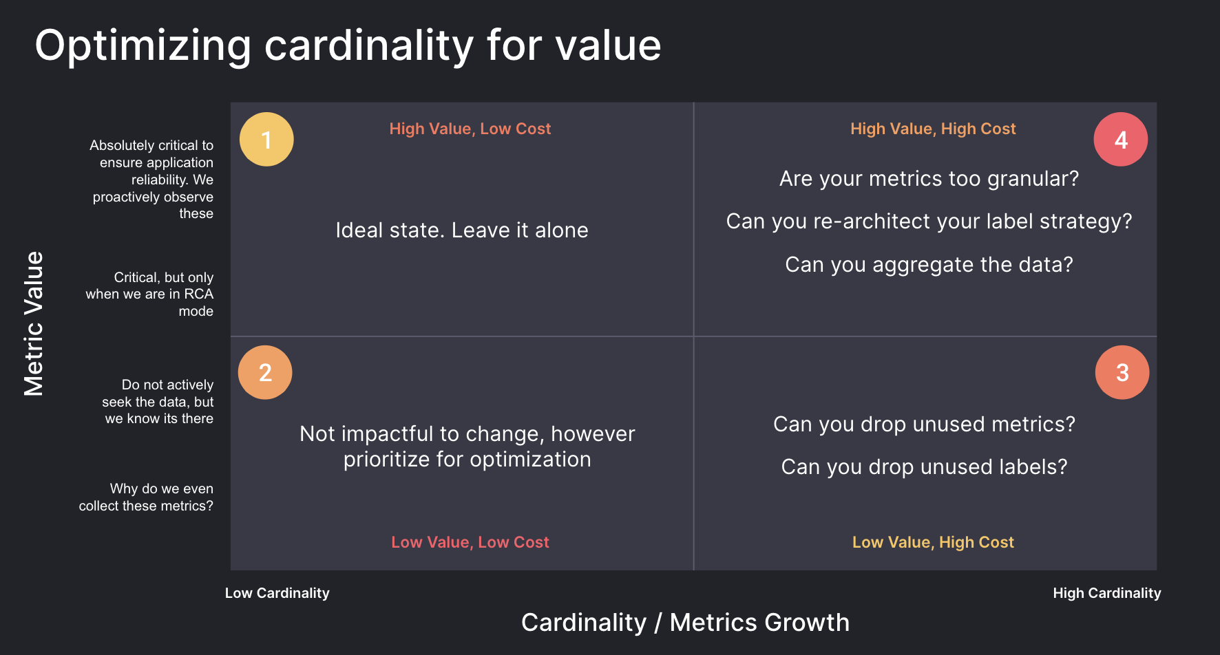 The diagram below shows metrics divided into four quadrants based on cardinality and value. You will want to begin by identifying the metrics in quadrant 3, which are high cost, but are not being used. For the metrics that fall into quadrant 4, re-evaluating the granularity and label architecture can produce great returns for metrics and labels that provide value, but have high cardinality.