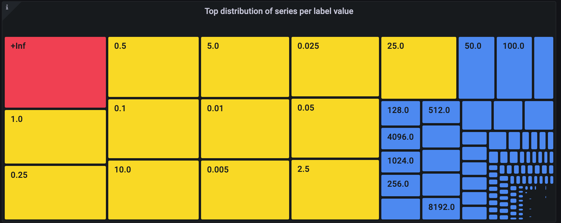 Using the cardinality management Grafana dashboard in Grafana Cloud, we can see the values for the le label and how this contributes to the overall cardinality. Choose buckets which are most relevant for your environment. For example, if the SLO for a service is a 50 mSec response time, you may not need to distinguish between requests that take 5 mSec and 10 mSec.