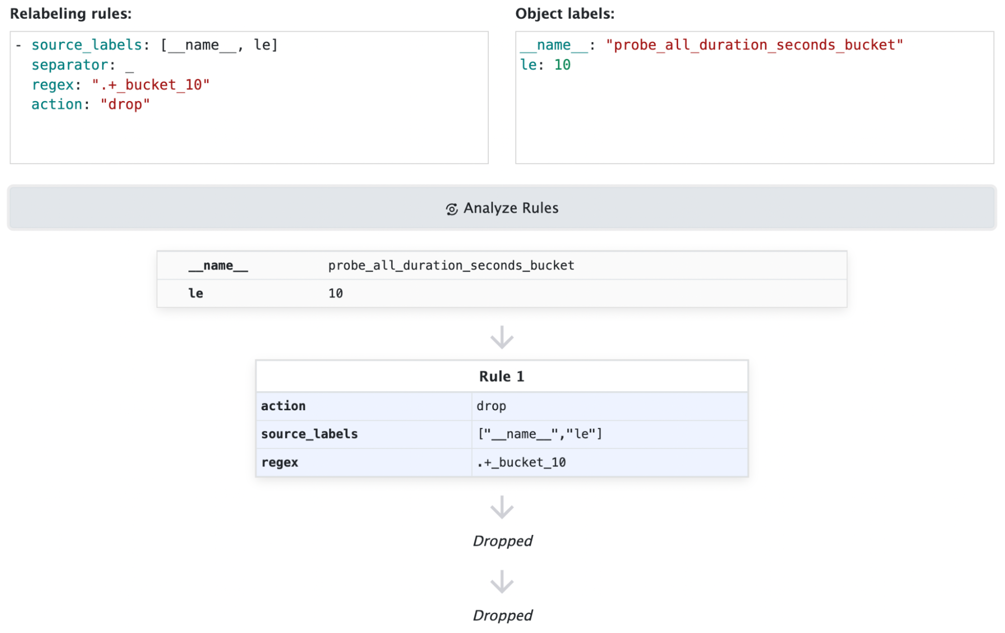 You can safely drop the metrics series for buckets that are not needed. This will not result in data loss as the buckets are cumulative. For example, if you drop the “less than or equal to 10” bucket, these values will simply be included in the “less than or equal to 25” bucket. If this level of dimensionality is not required, you can safely drop the 10 value for the le label.