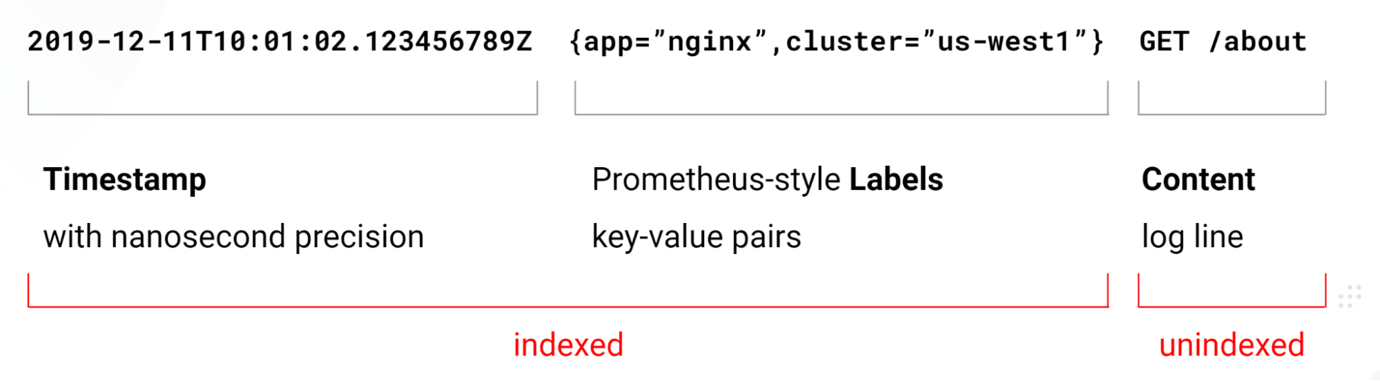 Loki was designed to build a very small index. We only index the Prometheus-style labels that define what we call a log stream.