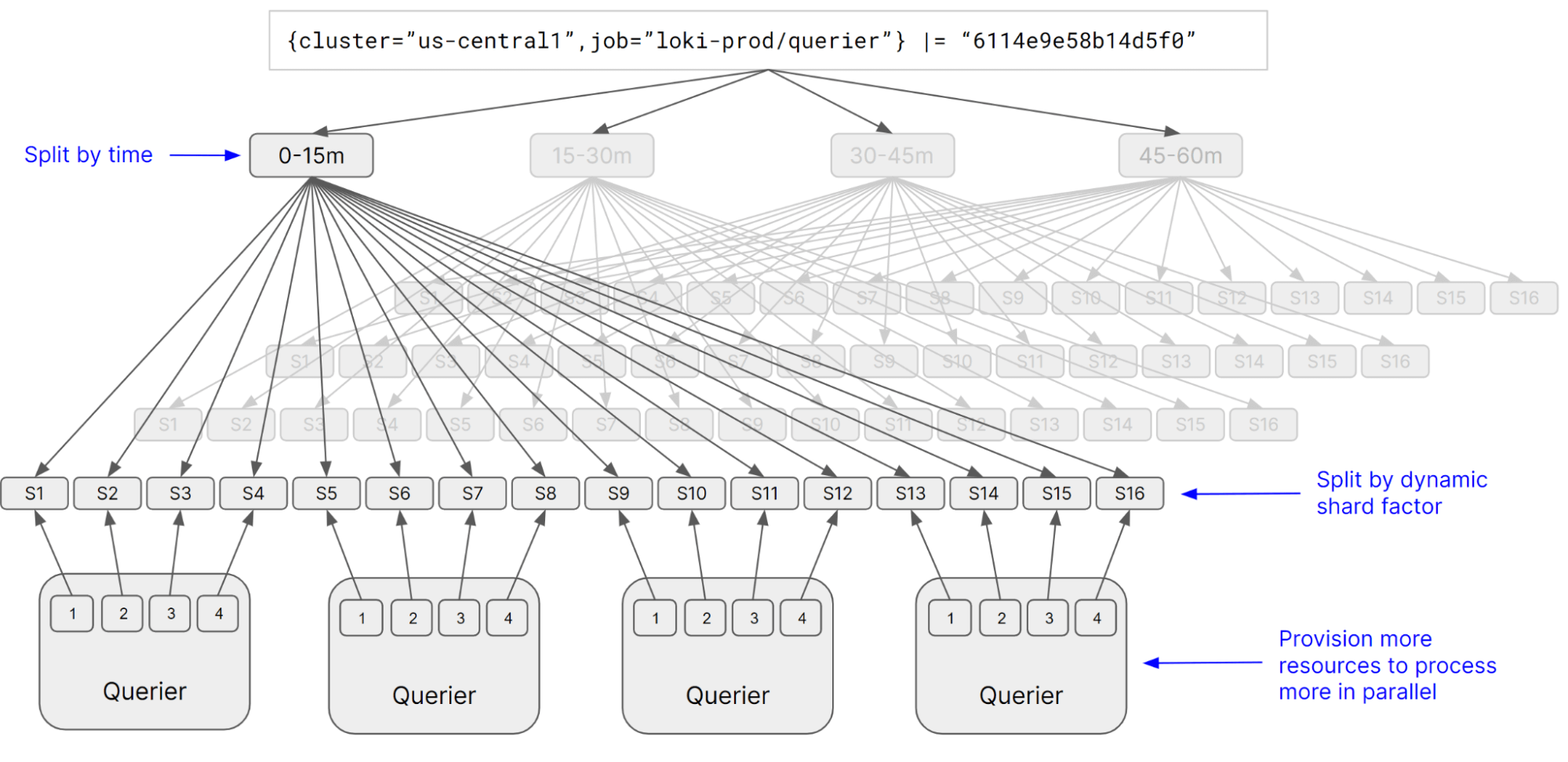 Query performance is obtained by using a tremendous amount of parallelization, splitting queries into smaller subqueries which can all be executed at the same time. It’s a common misconception that a large index is necessary to make queries fast. However, Loki can process your data at hundreds of gigabytes per second by using thousands of parallel workers. These workers can be cost effective, too, by leveraging spot instances and only being provisioned on demand to meet query load.