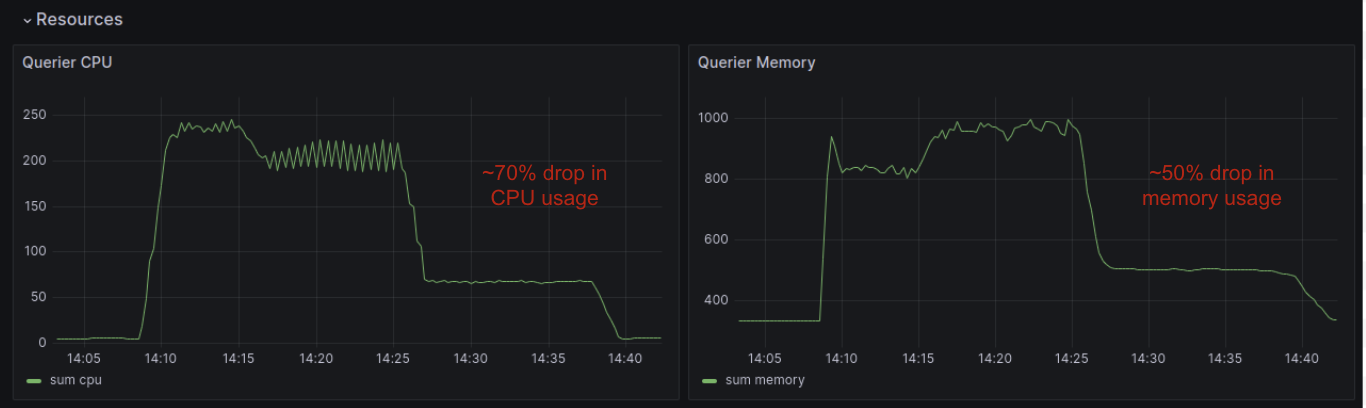 We’ve tested this in clusters of more than 600 MB/s and 1.2 million spans/s, with great success. During a load test in one of these clusters, we experienced decreases of tail latency of up to 75%, and decreases of CPU and memory usage in Tempo’s queriers of up to 70% and 50%, respectively.
