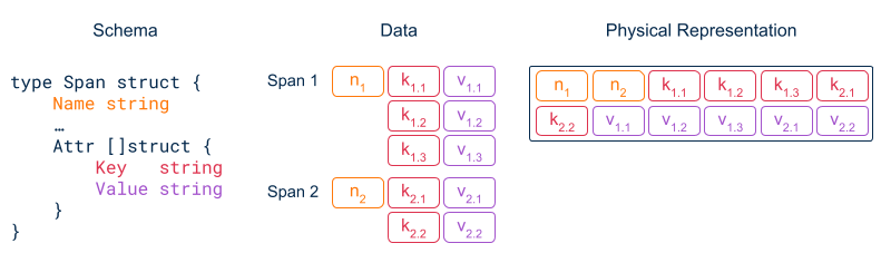 The figure above illustrates a simplified schema of a span with generic key-value columns for its attributes. In production tracing data, it is common for spans to have dozens of attributes and the generic attribute columns can constitute up to 70% of the overall block size.