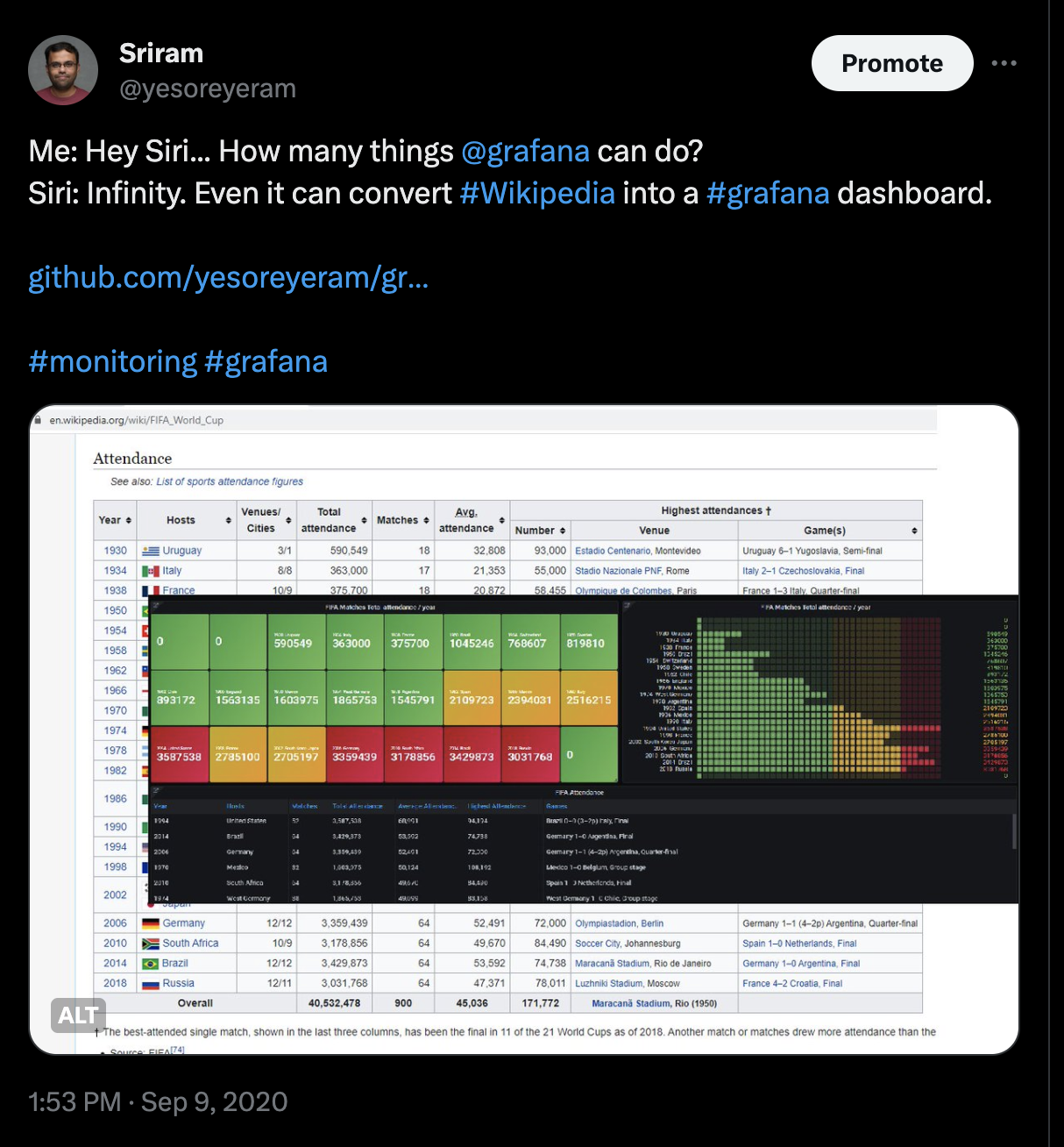 This all changed in 2020 with the introduction of the Infinity data source plugin. Initially conceived as my personal side project, the Infinity plugin grew out of a quest to visualize data scraped from Wikipedia: