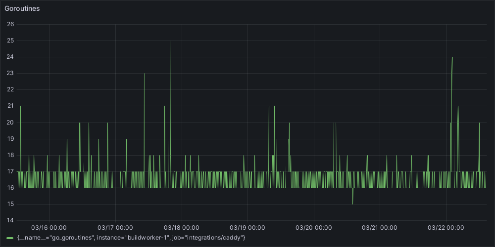 We quickly learned we had a goroutine leak due to long-running builds that included some of our heavier modules. We observed in a time series chart the number of goroutines growing over long periods, but never touching the zero line: