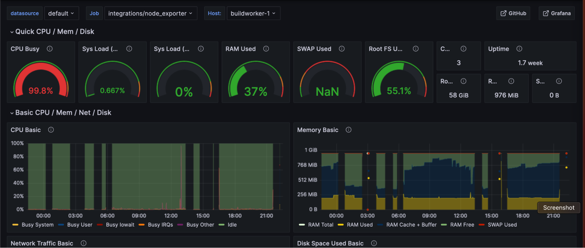 To get started with Grafana Cloud, we followed the integration onboarding steps to install and configure Grafana Agent on all our servers. Knowing our buildworker was the bottleneck, we customized a dashboard to inspect various angles of the buildworker node. The node_exporter was vital to understand how our workload affected the instance it’s running on.