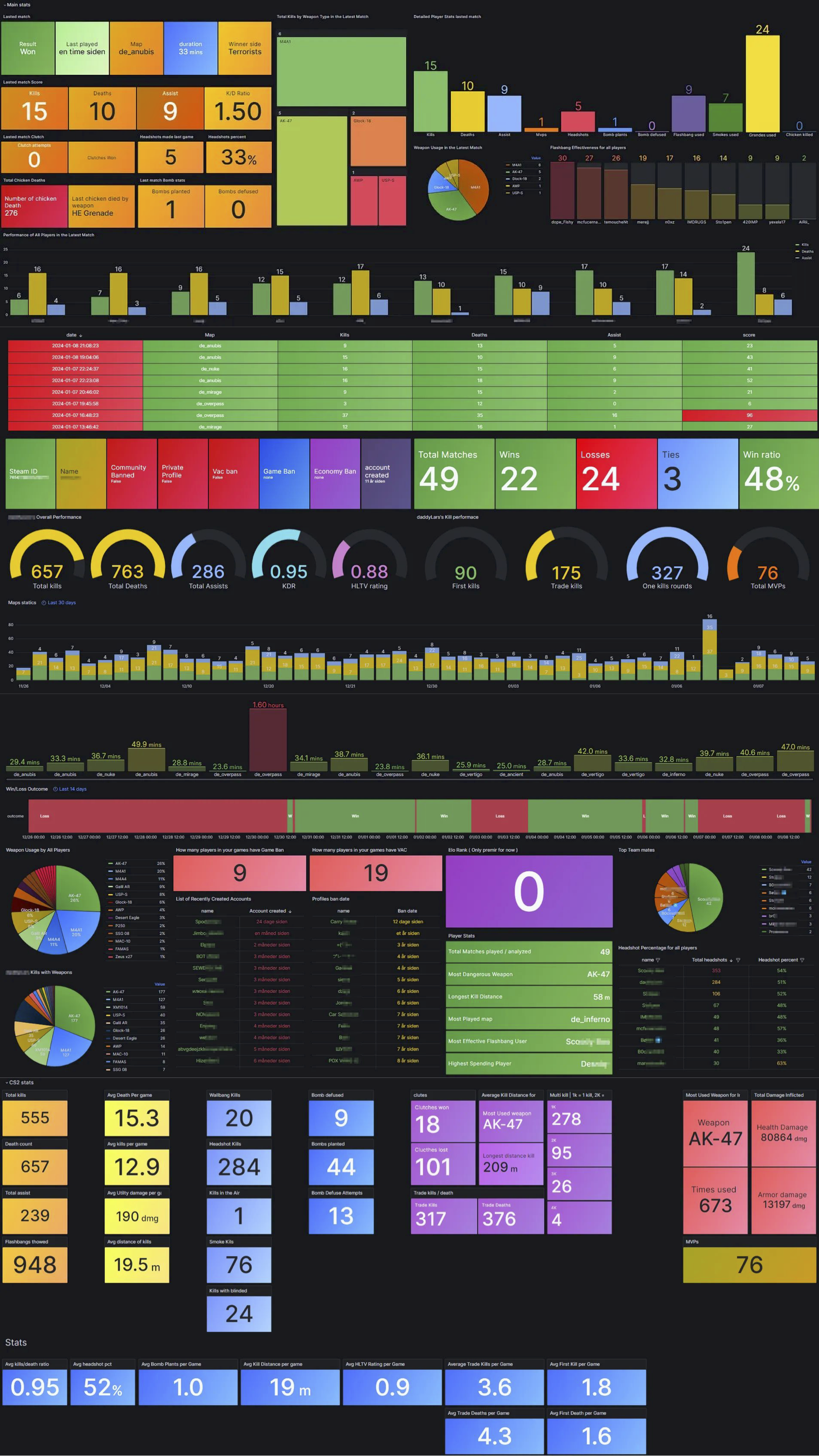 Andreas Rahimic Andersen uses his dashboard to track his usage of the popular video game series Counter-Strike. He tracks matches, metrics, and game stats, and he plans to use it in the future for tournaments. The data is sent from an OSS project called CS Demo Manager to a PostgreSQL database and then to Grafana. He’d seen similar sites that could track games, but he wanted to run it locally — and he wanted a challenge.