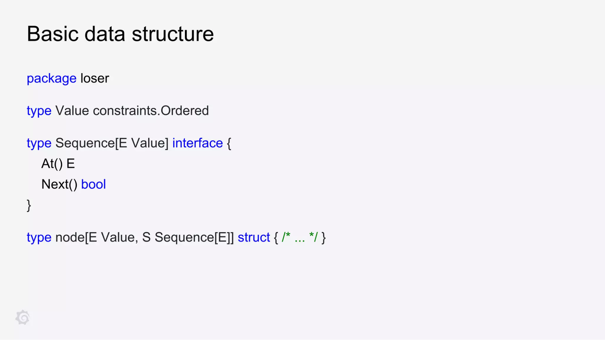 He shared the below example of a basic data structure in Go for a loser tree, walking attendees through different parameters, including value type and sequence type: