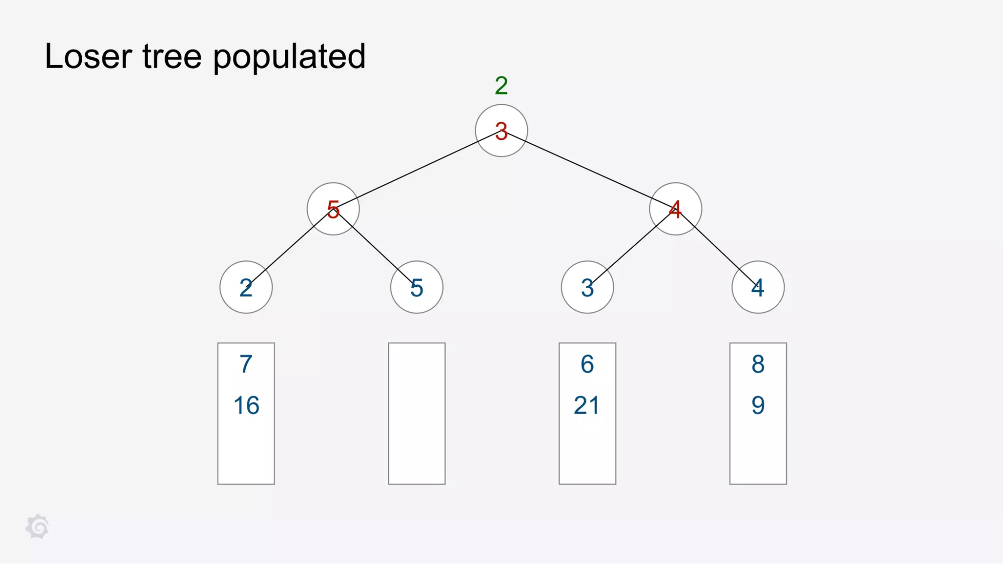 So, Bryan said, he started to look for a solution. In his research, he found that you can accelerate a k-way merge by more quickly identifying the smallest element in the sequence. One way to do this is with a type of tournament tree algorithm that only stores the loser of each game — an algorithm or data structure that’s known (you guessed it) as a loser tree.