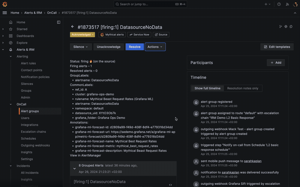 Grafana IRM is actually a suite of services (Grafana Alerting, Grafana Incident, Grafana OnCall, Grafana SLOs) and we’ve been working hard to better integrate the tooling. For example, we’re improving team coordination during incidents by pairing Grafana Incident with Grafana OnCall.