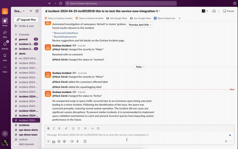 - Single Slack App for Grafana OnCall and Grafana Incident. To streamline the user experience, we’re merging our Slack applications into a single Slack app for both tools. This integration will simplify the setup and maintenance of our tools within your Slack environment, reducing complexity and enhancing the flow of information between teams.
