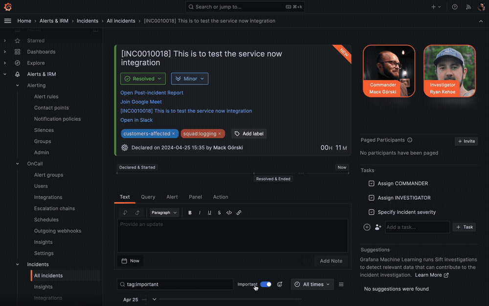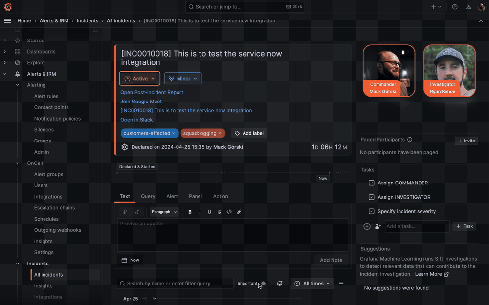 A central component of this strategy is Grafana Incident, which removes the toilsome tasks of incident management so you can focus on actually fixing the issue faster. We introduced Grafana Incident two years ago, and we’ve made a ton of improvements since then. In this blog post, we want to highlight some of the recent innovations that have reshaped our approach to incident management and provide a quick preview of what’s next so your team is well-equipped for the challenges ahead.