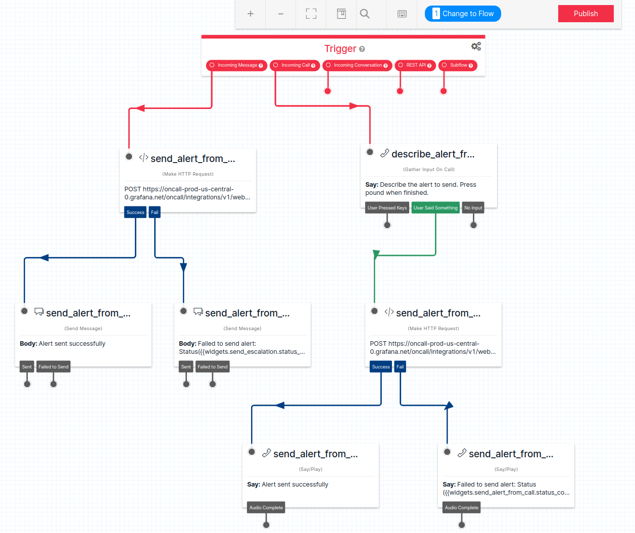 <YOUR_INTEGRATION_URL>at Lines 54 and 156 with the URL of the webhook integration we created earlier in Grafana OnCall. Then press Next.{ "description": "Basic SMS and Call escalation", "states": [ { "name": "Trigger", "type": "trigger", "transitions": [ { "next": "send_alert_from_sms", "event": "incomingMessage" }, { "next": "describe_alert_from_call", "event": "incomingCall" }, { "event": "incomingConversationMessage" }, { "event": "incomingRequest" }, { "event": "incomingParent" } ], "properties": { "offset": { "x": 0, "y": 0 } } }, { "name": "send_alert_from_sms", "type": "make-http-request", "transitions": [ { "next": "send_alert_from_sms_success", "event": "success" }, { "next": "send_alert_from_sms_fail", "event": "failed" } ], "properties": { "offset": { "x": -180, "y": 250 }, "method": "POST", "content_type": "application/json;charset=utf-8", "body": "{\"from\":\"{{trigger.message.From}}\",\"message\":\"{{trigger.message.Body}}\"}", "url": "<YOUR_INTEGRATION_URL>" } }, { "name": "send_alert_from_sms_success", "type": "send-message", "transitions": [ { "event": "sent" }, { "event": "failed" } ], "properties": { "offset": { "x": -410, "y": 590 }, "service": "{{trigger.message.InstanceSid}}", "channel": "{{trigger.message.ChannelSid}}", "from": "{{flow.channel.address}}", "message_type": "custom", "to": "{{contact.channel.address}}", "body": "Alert sent successfully" } }, { "name": "send_alert_from_sms_fail", "type": "send-message", "transitions": [ { "event": "sent" }, { "event": "failed" } ], "properties": { "offset": { "x": -60, "y": 590 }, "service": "{{trigger.message.InstanceSid}}", "channel": "{{trigger.message.ChannelSid}}", "from": "{{flow.channel.address}}", "message_type": "custom", "to": "{{contact.channel.address}}", "body": "Failed to send alert: Status({{widgets.send_escalation.status_code}})" } }, { "name": "describe_alert_from_call", "type": "gather-input-on-call", "transitions": [ { "event": "keypress" }, { "next": "send_alert_from_call", "event": "speech" }, { "event": "timeout" } ], "properties": { "speech_timeout": "auto", "offset": { "x": 350, "y": 240 }, "loop": 1, "finish_on_key": "#", "say": "Describe the alert to send. Press pound when finished.", "stop_gather": true, "gather_language": "en", "profanity_filter": "true", "timeout": 60 } }, { "name": "send_alert_from_call", "type": "make-http-request", "transitions": [ { "next": "send_alert_from_call_success", "event": "success" }, { "next": "send_alert_from_call_fail", "event": "failed" } ], "properties": { "offset": { "x": 360, "y": 590 }, "method": "POST", "content_type": "application/json;charset=utf-8", "body": "{\"from\":\"{{trigger.call.From}}\", \"message\":\"{{widgets.describe_alert_from_call.SpeechResult}} \"}", "url": "<YOUR_INTEGRATION_URL>" } }, { "name": "send_alert_from_call_success", "type": "say-play", "transitions": [ { "event": "audioComplete" } ], "properties": { "offset": { "x": 90, "y": 900 }, "loop": 1, "say": "Alert sent successfully" } }, { "name": "send_alert_from_call_fail", "type": "say-play", "transitions": [ { "event": "audioComplete" } ], "properties": { "offset": { "x": 520, "y": 900 }, "loop": 1, "say": "Failed to send alert: Status ({{widgets.send_alert_from_call.status_code}})" } } ], "initial_state": "Trigger", "flags": { "allow_concurrent_calls": true } }After importing you should see something like this: