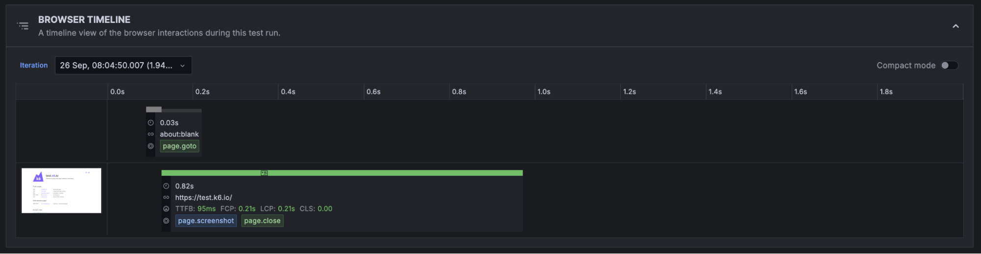 Understanding how your application behaves during test execution is crucial, which is why browser tests in Grafana Cloud k6 provide comprehensive tracing capabilities. The Browser Timeline section shows a separate view where you can inspect the individual Web Vital metrics for each page in your test run and each method that was invoked for each page.