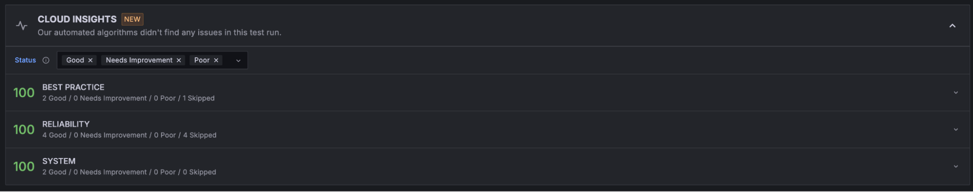 Cloud Insights automatically analyzes telemetry data, such as metrics, logs, and traces, to identify potential issues within the system you’re testing or within your k6 test script. Cloud Insights also analyzes the underlying Grafana Cloud k6 infrastructure to understand any implications it may have had on your test run.