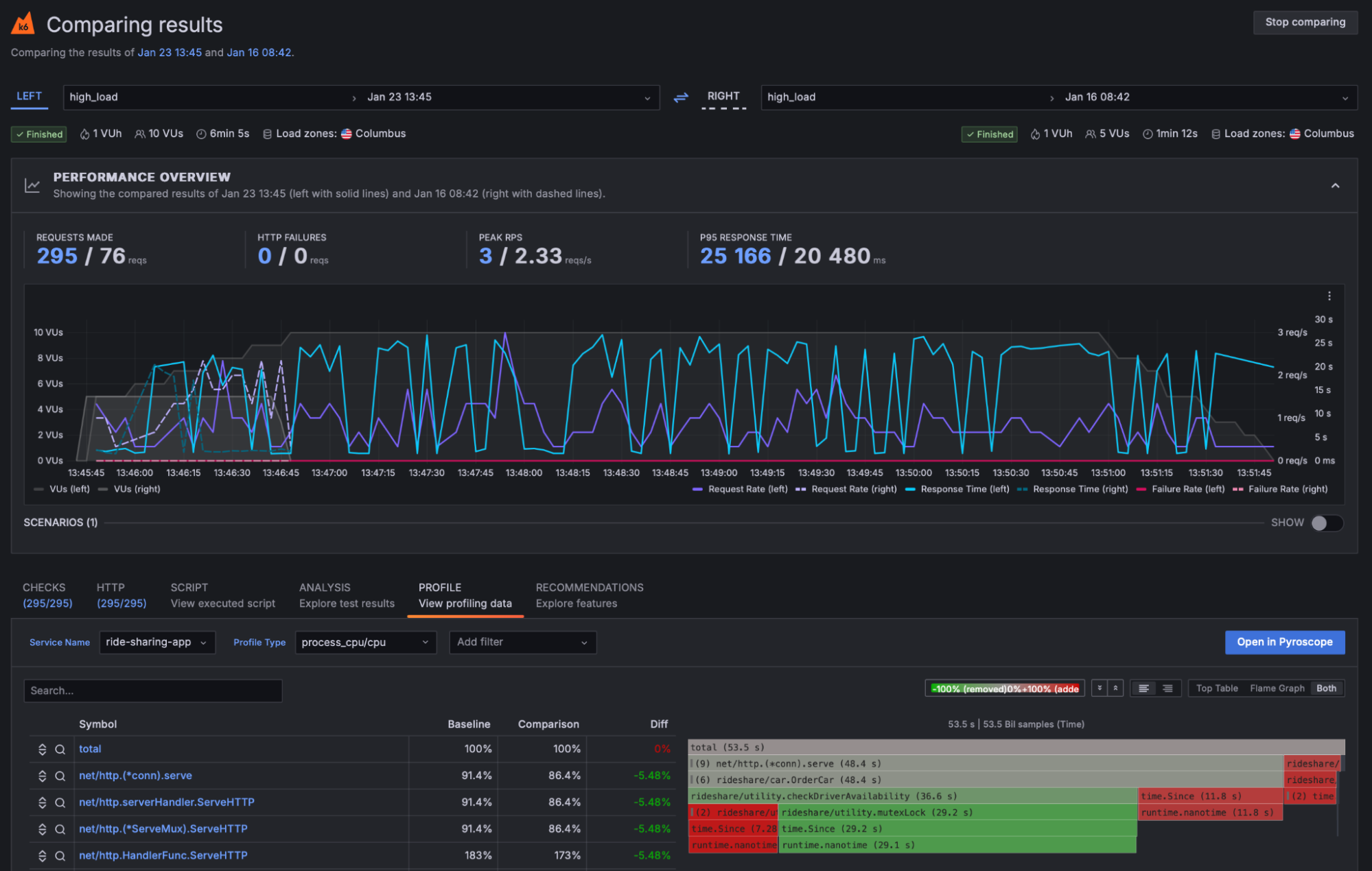 You can also view the difference between two test runs in Explore Profiles or Grafana Cloud k6.