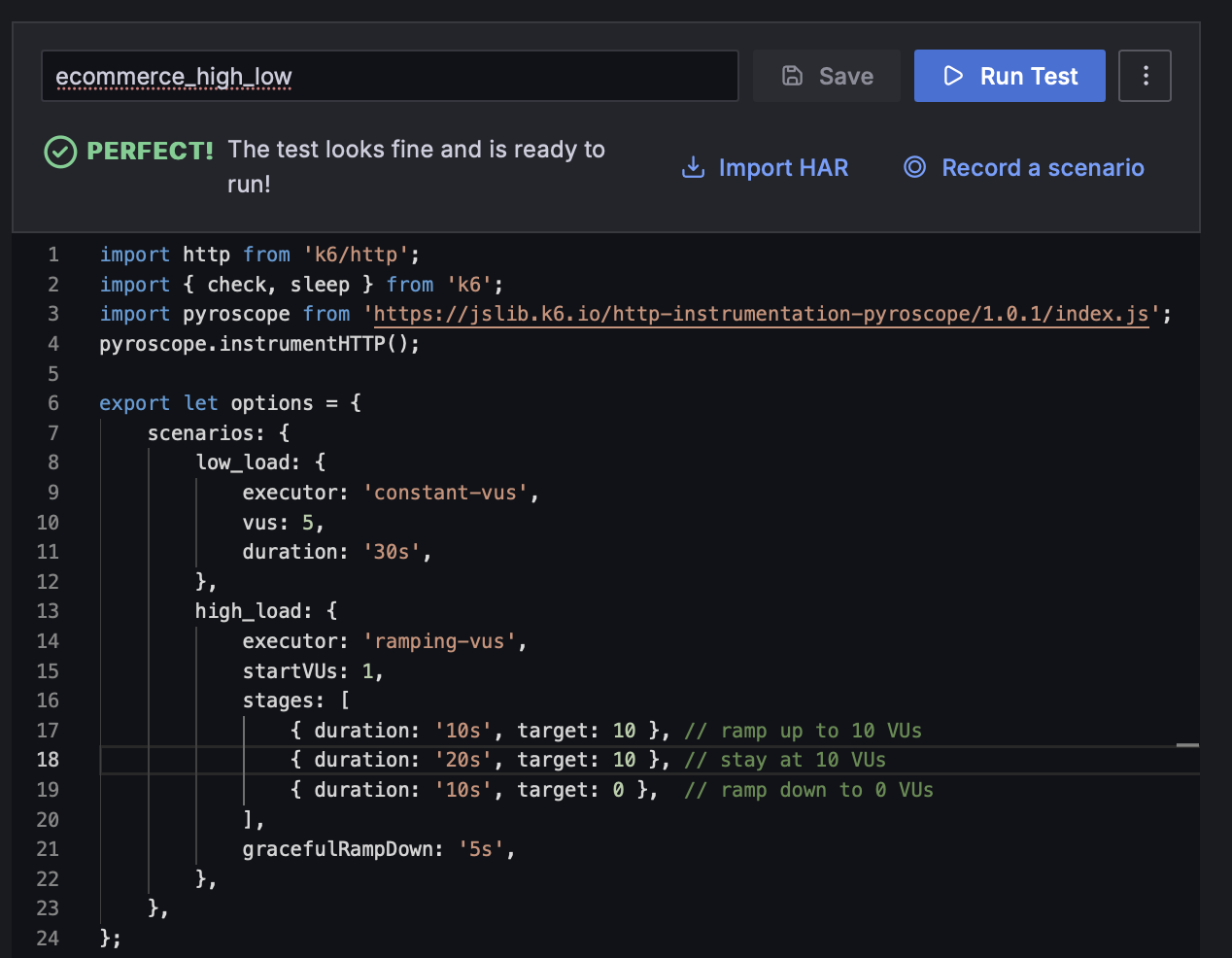 - Run your test in Grafana Cloud k6: Define scenarios and ramp-up periods to mimic real-world traffic patterns.